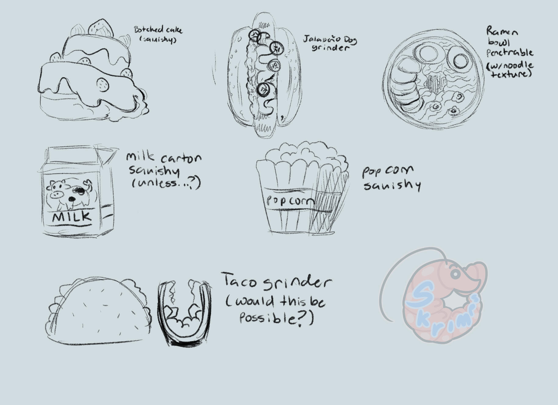 Separate ideas inspired by food themes! I'll slowly be hashing some of these out. Currently made: Jalapeno Dog and Taco Grinder (El Diablo).